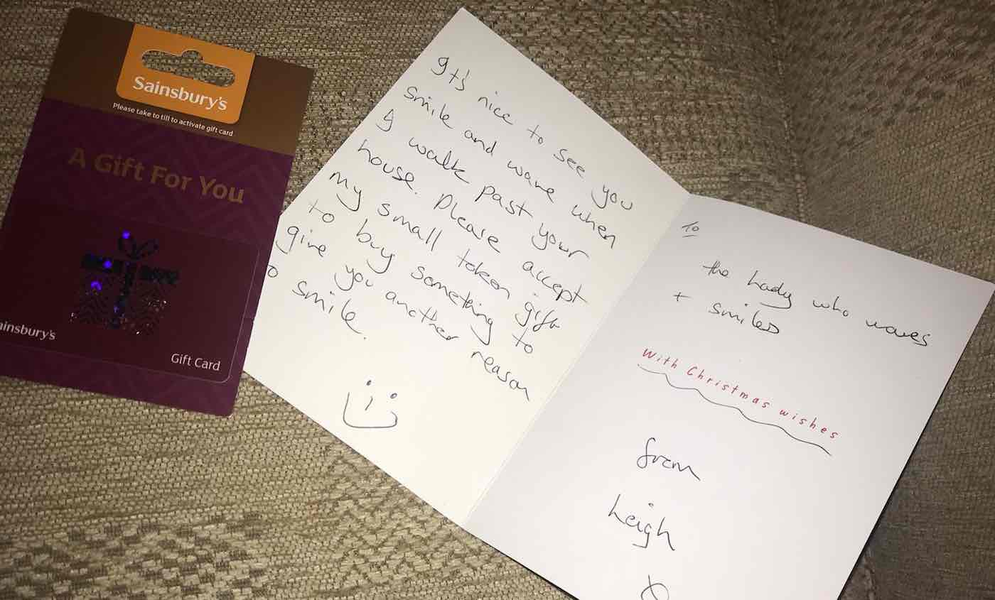 “To the lady who waves and smiles, with Christmas wishes,” read the card. “It’s nice to see you smile and wave when I walk past your house. Please accept my small token gift to give you another reason to smile.”