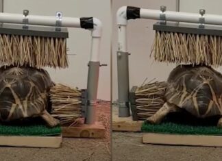 Watch This Lucky Tortoise Enjoy His Homemade Scratcher Device Crafted From Broom Heads