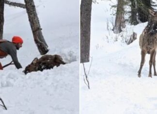 Man Saves Elk After it Was Buried in an Avalanche – With Only a Nostril And One Eye Peeking Out of the Snow