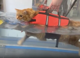 Flabby Feline Has Taken to Swimming Lessons for Losing Weight–And it’s Working