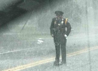 Police Officer Stands in the Pouring Rain With a Smile as She Protects Critter From Traffic
