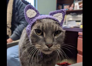 Stray Cat With No Ears Finally Adopted After Shelter Worker Crochets Her a Pair of Purple Ones