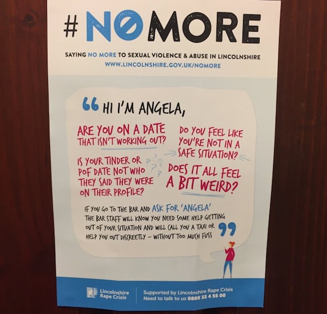 The poster reads: “Are you on a date that isn’t working out? Is your Tinder or POF [Plenty of Fish] date not who they said they were on their profile? Do you feel like you’re not in a safe situation? Does it all feel a bit weird? If you go to the bar and ask for ‘Angela,’ the bar staff will know you need help getting out of your situation and will call you a taxi or help you out discreetly—without too much fuss.”