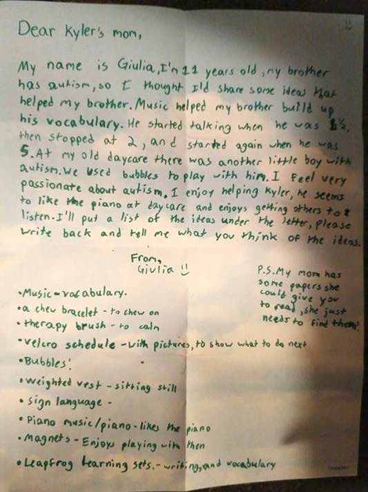 “I feel very passionate about autism. I enjoy helping Kyler. He seems to like the piano at daycare and enjoys getting others to listen. I’ll put a list of the ideas under the letter, please write back and tell me what you think of the ideas.”