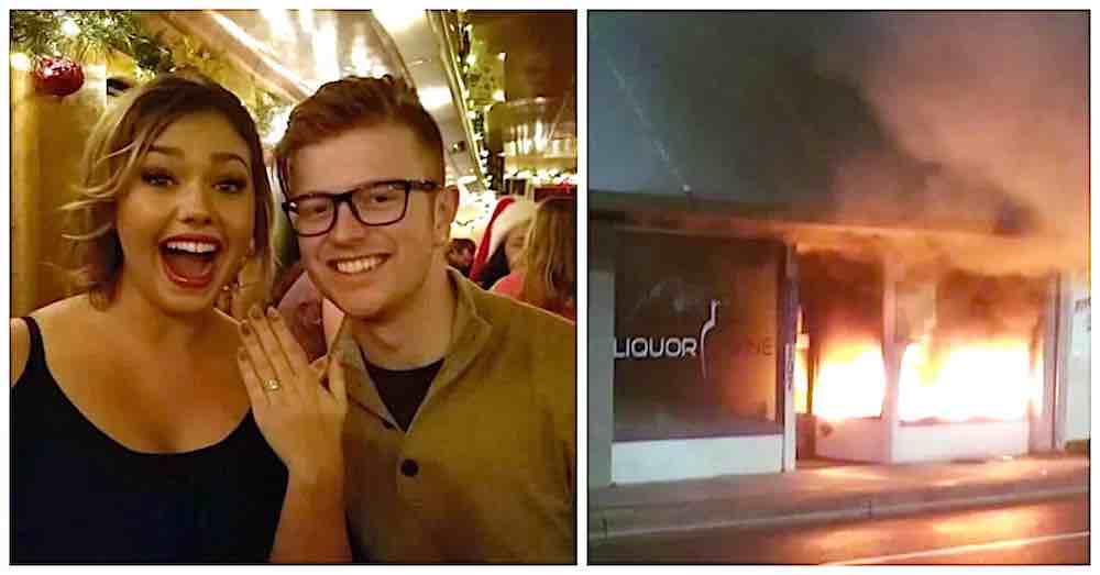 Afterward, the newly-engaged couple was driving home when the fiancée spotted a fire inside a liquor store.