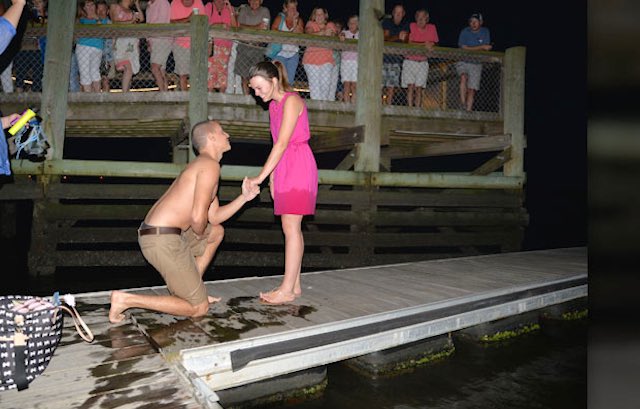 He was down on one leg on the dock of the Old American Fish restaurant asking Kayla Harrity to marry him and the ring slipped out of box, through the crack in the boardwalk, and into the sea water.
