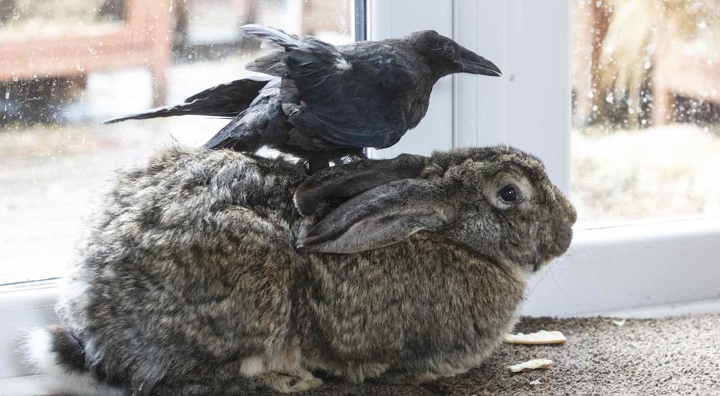 A crow hand-reared by a couple believes he’s a rabbit—hopping around their hutch and eating their food—after being adopted by their five bunnies.