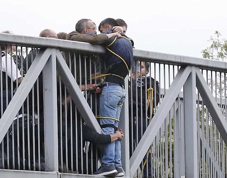 Despite it taking two hours for proper help to arrive, these members of the public refused to let go of a suicidal man preparing to jump off of a bridge.