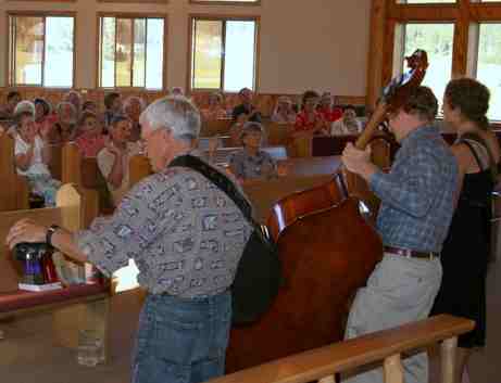 (Northern Michigan folk band White Water performs at Custer Lutheran fellowship Church in SD to benefit the White Buffalo Calf Woman Society, left to right are Dean Premo and his adult children, Evan and Laurel Premo, from Amasa, Mich., who have been performing as a family string band for 20 years — Photo by Javier H. Alegree)