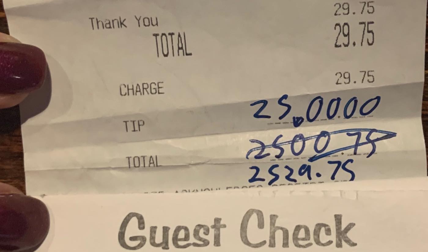 The patron, a middle-aged man who insisted on remaining anonymous, left a $2,500 tip on a bill totaling just $29.75.