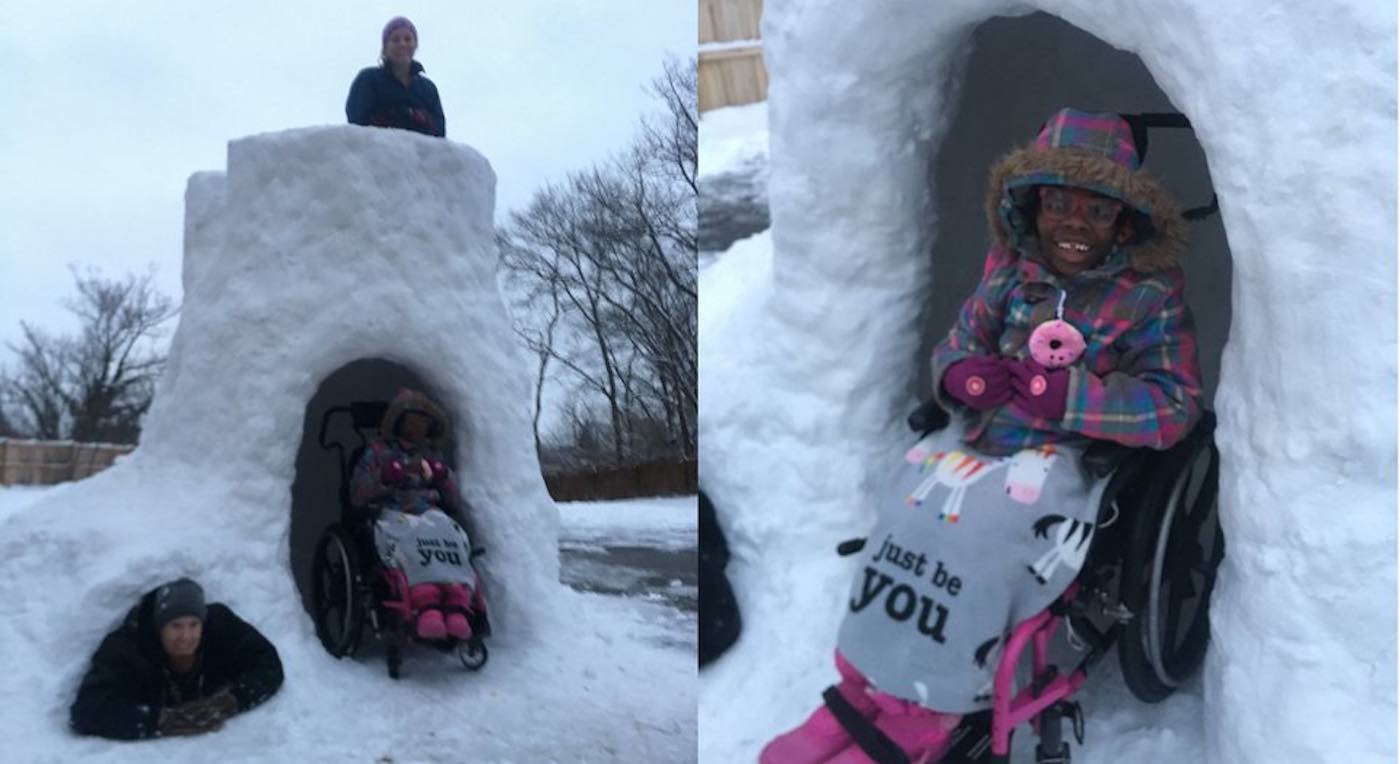So when their home in Cincinnati, Ohio was blanketed in snow last week, Eichhorn built a massive igloo for his kids to play in. Not only that, he added a little nook at the base of the tower so that his two kids in wheelchairs could join in on the fun.