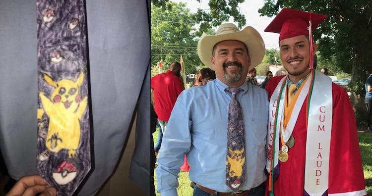An 18-year-old who graduated from high school earlier this week was honored not just by his school – but also by his father sporting a hand drawn Pokémon tie that his son made him in 1st grade.