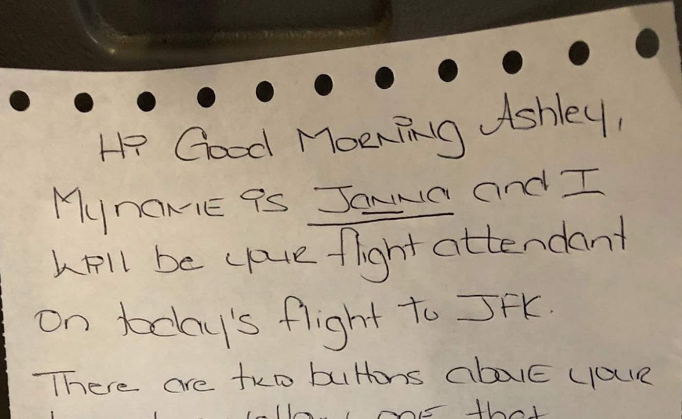 Shortly after Ashley’s plane took off from Baltimore, her Delta airline flight attendant handed her a handwritten note which explained everything about the flight and safety information.