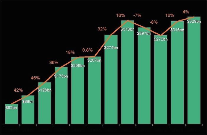 The biggest piece of the $329.3 billion invested in clean energy last year was from the financing of utility-scale projects such as wind farms, (like the string of large offshore wind arrays in the North Sea and off the coast of China), solar parks, biomass and waste-to-energy plants and small hydro-electric schemes. These totaled $199 billion, up 6% over the previous year.