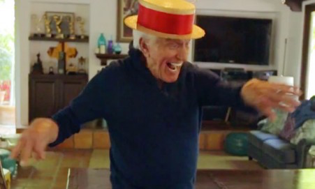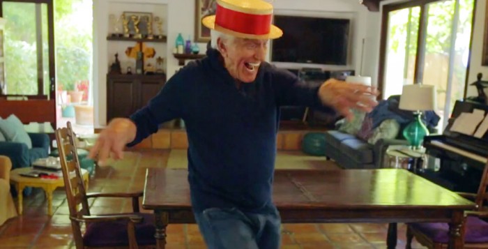 The sprightly 89-year-old appears with his real-life wife, Arlene Silver, showing off his high-stepping moves in order to entice her to dance.