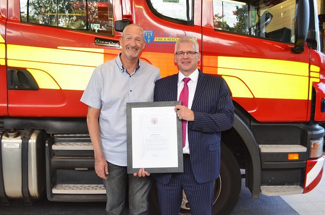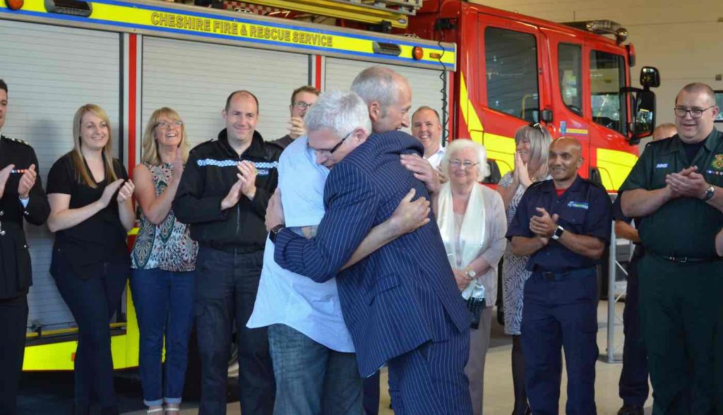 He was also able to thank everyone involved in his rescue at an evening reunion which was held at the Northwich Fire Station. Surrounded by the other doctors, firefighters, paramedics, and police, Dr. Forrest was given a commendation by the chief fire officer for his work that fateful day.