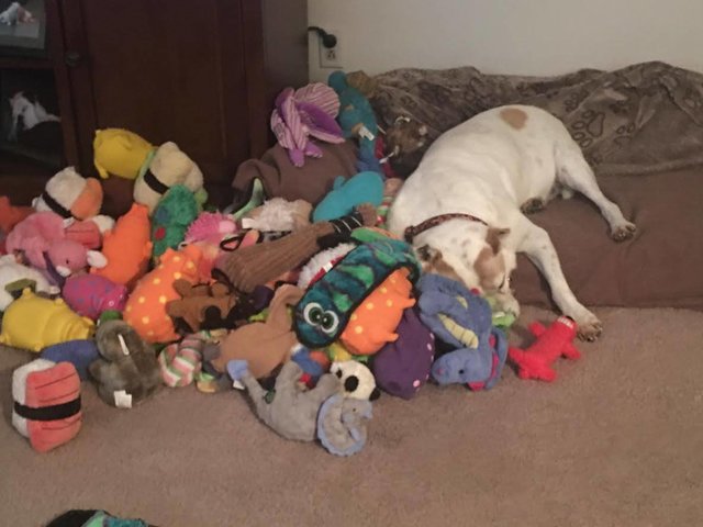 The couple immediately decided to adopt the elderly hound and shower him with love, attention, and care for the rest of his years. Since they started spoiling the canine with dozens of toys ,Jojo reportedly carries each one to bed at the end of the day so he can sleep in a pile of goodies every night.