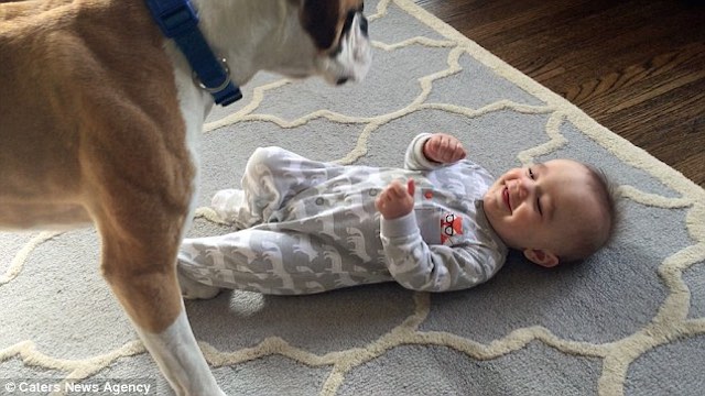 When 9-month-old Graham starts crying, Jeeves the boxer pup starts tickling the baby with his nose to stop the wails.
