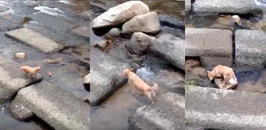 Ryan Faw was walking alongside a stream in Kobe, Japan when he saw a clever little dog who was using the river current in order to play ball with itself.