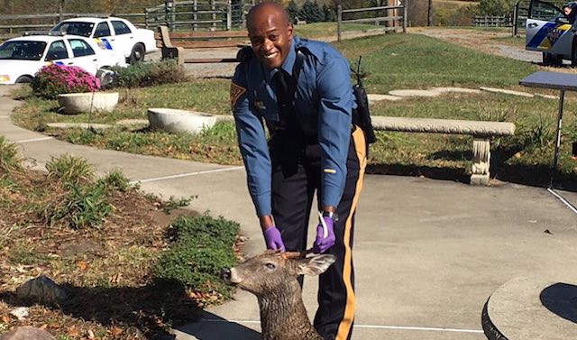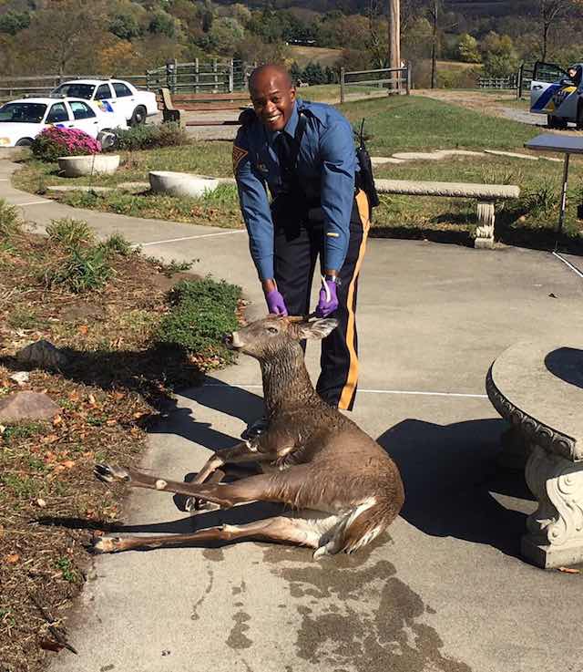 Officer Dwayne Phillips is just one of the boys in blue at the New Jersey Police Department who has been trained to protect and serve humans – but never before this week has he ever served a deer.