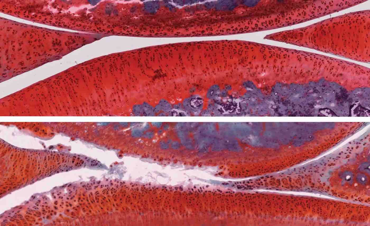 Six weeks after the treatment, rats that had received control particles had more severe osteoarthritis in their knees, with the disease progressing from stage 2 to stage 4. However, rats that had received particles containing αKLOTHO and TGFβR2 DNA showed recovery of their cartilage: the cartilage was thicker, fewer cells were dying, and actively proliferating cells were present. These animals’ disease improved from stage 2 to stage 1, a mild form of osteoarthritis, and no negative side effects were observed.