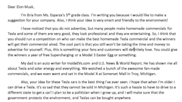 To conclude the adorable – and surprisingly articulate – note, Bria expresses her plans to one day drive her own Tesla-made vehicle… after she gets her license, of course.