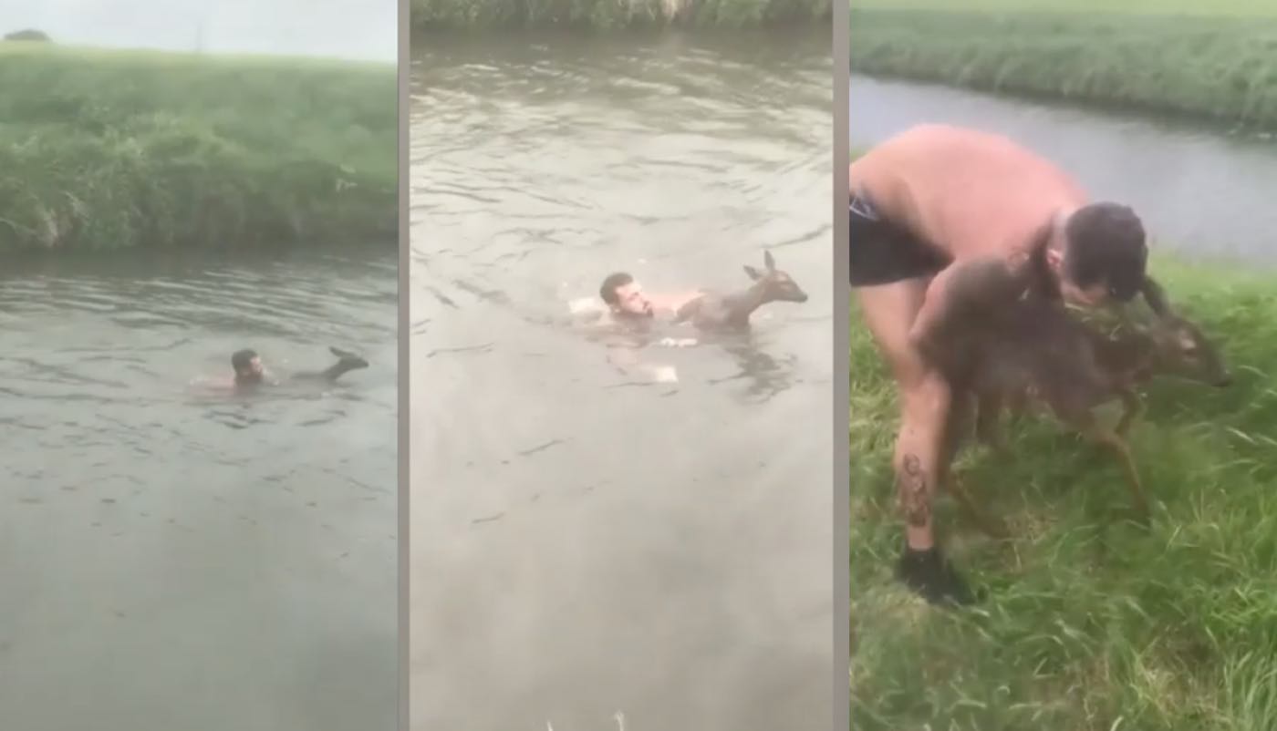 Without hesitation, Headon took off his clothes and plunged into the river. As Toyne cheered him on and filmed the rescue mission from the bank, Headon swam out to the deer, put his arm around its torso, and gently towed it back to the riverbank.