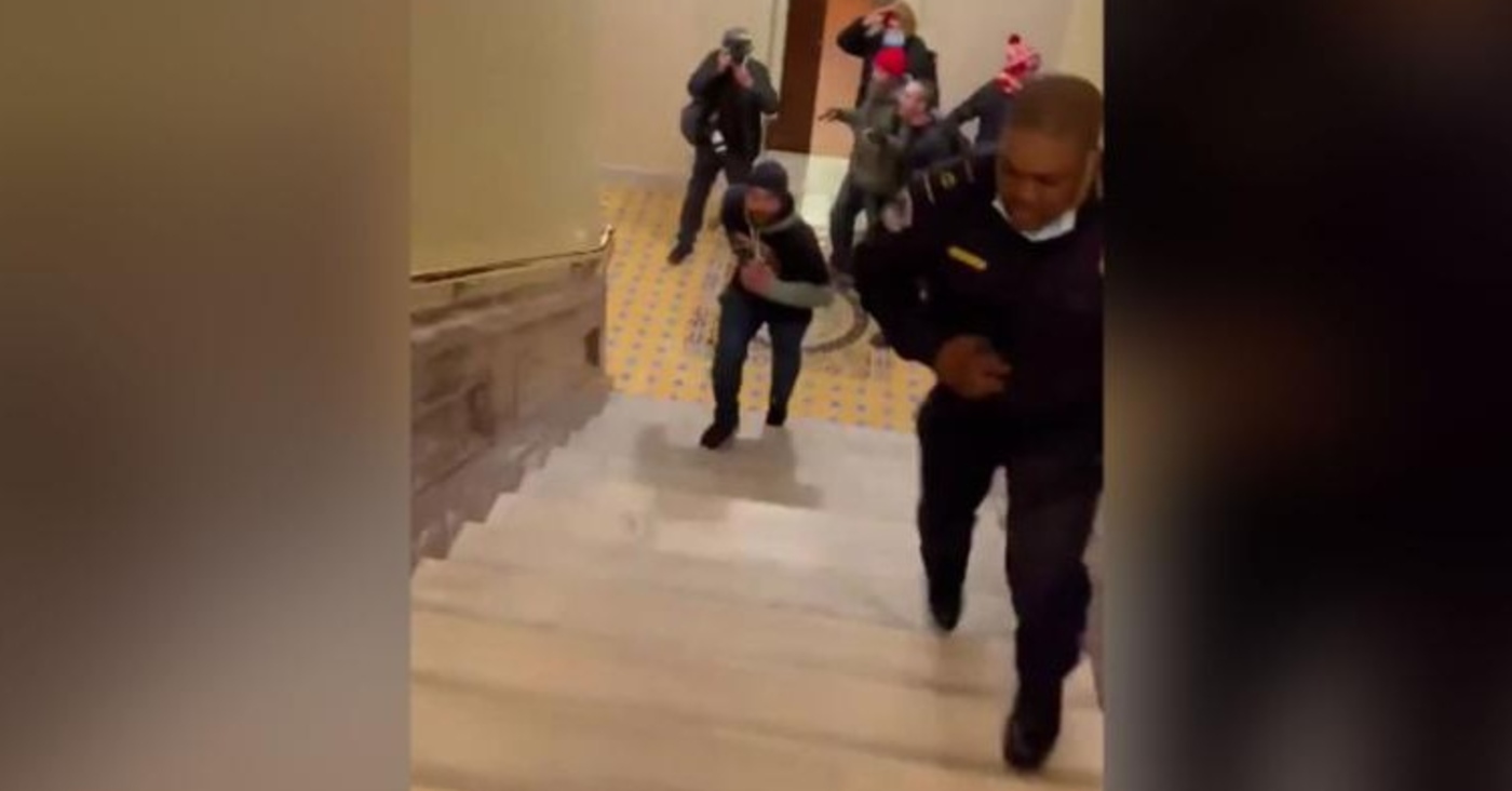 Footage shows Officer Eugene Goodman all alone and just a few steps ahead of rioters. They’re waving Confederate flags and shouting at him as they chase him up a flight of stairs inside the Capitol building.