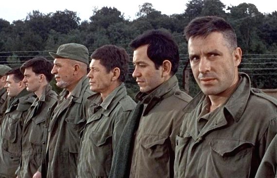 Based on the best-selling novel, the cast included many World War II American veterans who became actors, including Lee Marvin, Robert Webber and Robert Ryan (US Marines), Telly Savalas (US Army) and Charles Bronson (Army Air Forces), Ernest Borgnine (Navy), and Clint Walker (Merchant Marine). Jim Brown, one of the greatest NFL football players of all time, was forced to choose between his roles as running back and film star during the making of the film—he chose acting. (1967)