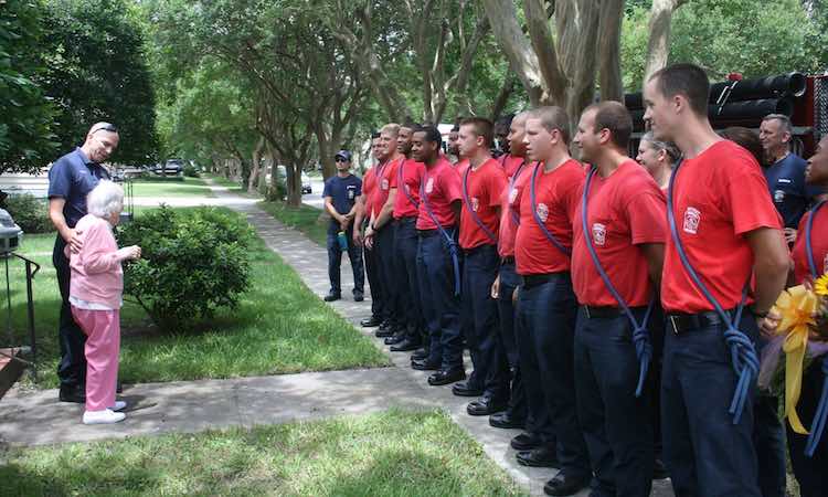 Firefighters escorted the grinning centenarian out to the reception line and presented her with a sunflower bouquet as the recruits applauded her.