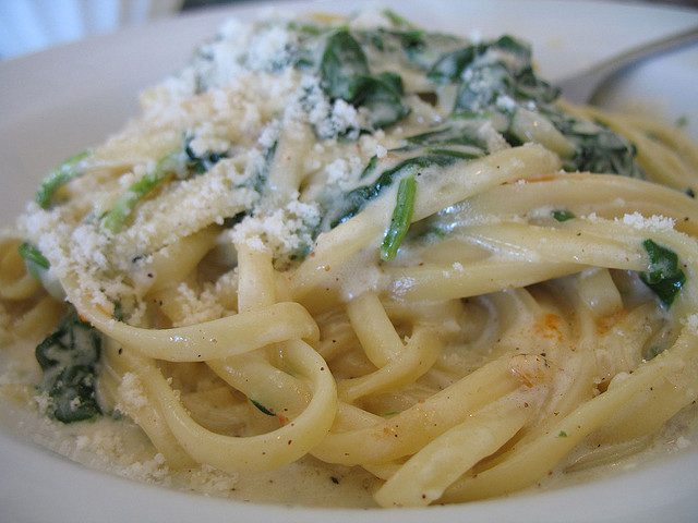 Defrost a box of frozen spinach, mix in 3/4 cup of marinara sauce and a few teaspoons of grated parmesan cheese—and voila!