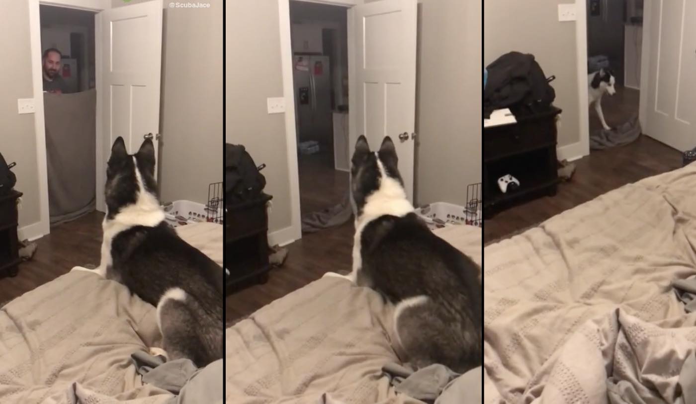 The pup had been enjoying an evening at home with her family when all of a sudden, her owner disappeared from behind a blanket.