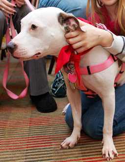 A few months earlier, someone surrendered the 39-pound Staffordshire Terrier mix to animal control in Philadelphia. Judging from her scarred body, Peyton had been used as a bait dog in vicious dog fighting rings. A day or two before her scheduled euthanization, a group called New Leash on Life plucked her from the shelter and brought her to a detention facility.