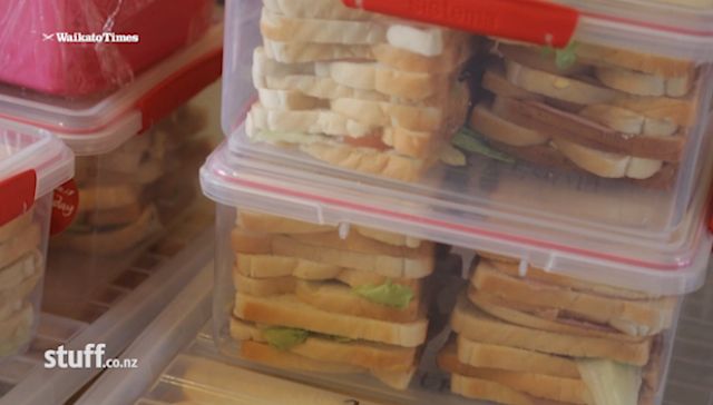 In a Waikato Times video you can see Tribal Huk gang members huddled in their hair nets carefully spreading mustard and assembling the tomatoes and ham that will feed 450-500 children in 25 schools.