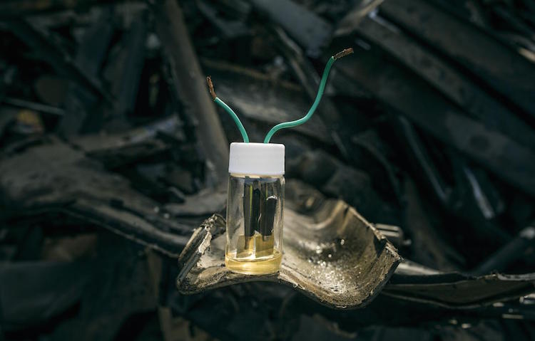 Take some metal scraps from the junkyard; put them in a glass jar with a common household chemical; and, voilà, you have a high-performance battery.