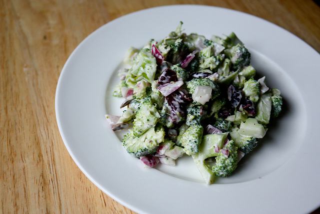 Swapping full fat mayonnaise for Greek yogurt not only saves you tons of calories and artery clogging fat, but Greek yogurt provides you with a whopping 18 grams of protein. Pre-packaged broccoli slaw makes this healthy summer salad extra easy and adds extra flavor and fiber. This tasty side is a wonderfully filling combination of fiber and protein.