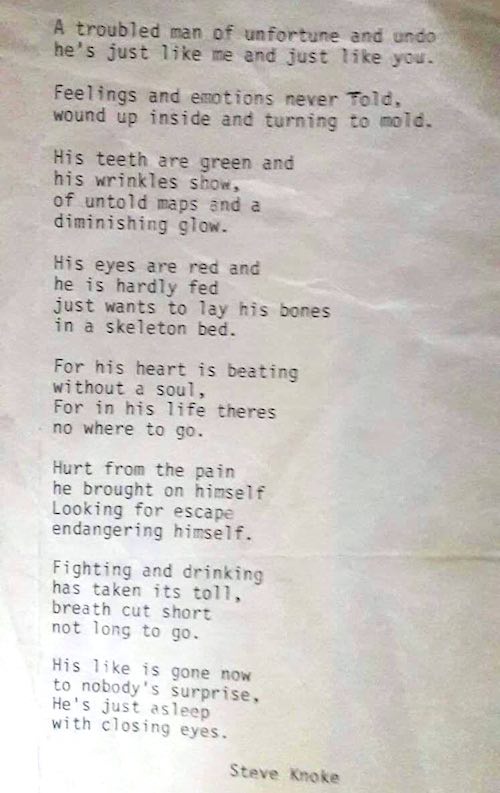 So far, they’ve raised just $290, so donate, if you can, to say farewell to Steve: “A kind homeless man, an artist, a poet, a brother, a son and a friend.”