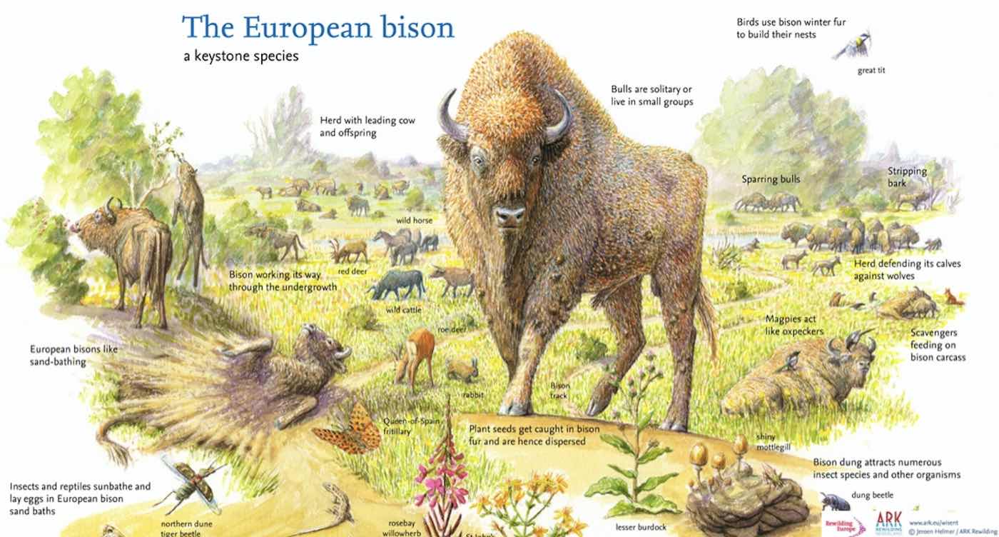 As the graphic above depicts, bison epitomize the concept of a keystone species, one that holds the ecosystem together through their actions, whether it’s dispersing seeds caught in their fur, or creating patches of clear earth for lizards to sunbathe in.