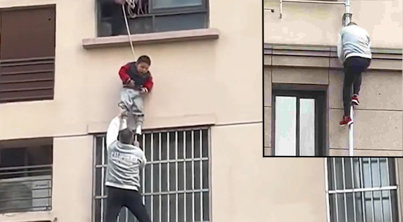 In the city of Changzhou, a casually-dressed middle-aged man was videotaped scaling a pipe to reach the second-floor ledge of a building where a child was crying, haven previously fallen out of a window another floor above.