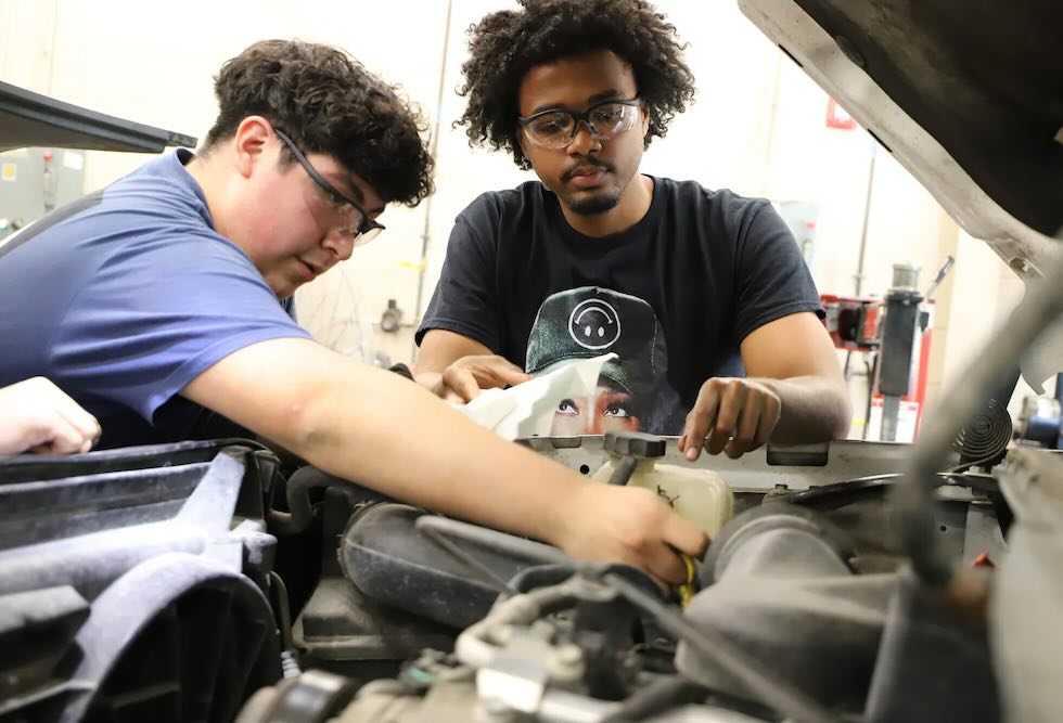 Around 20 students are working on cars each semester in the school, about an hour northwest of Richmond. The teacher, Shane Robertson, instructs kids on how to perform brake and tire repairs, change fluids, test batteries, and maintain heating and cooling systems.