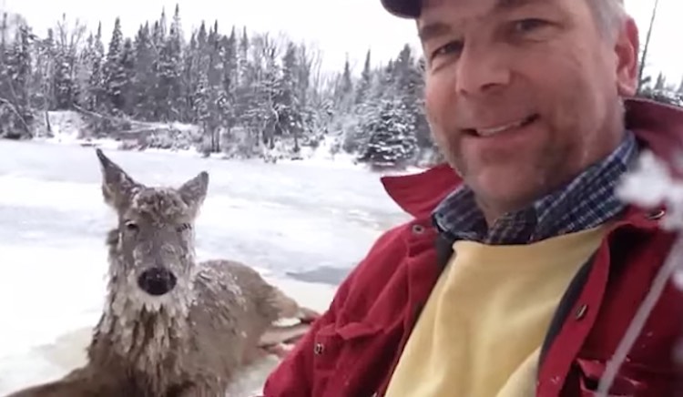 A man risked his life to save a young deer after it fell through the ice covering a freezing Minnesota river.