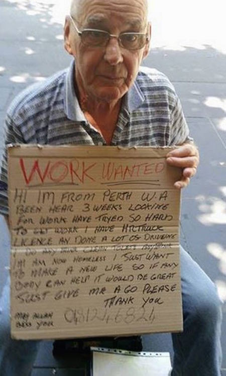 Sherryn Jackson was walking through the city center in Melbourne, Australia when she saw Barry: an elderly homeless man holding a sign with a long message inscribed in marker.
