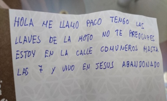 The note, which gave him the name of the shelter, read, “Hi, my name is Paco and I have the keys for your motorcycle. Don’t worry – I’m in the Comuneros street until 7 and then I’m at the Jesus abandonado.”