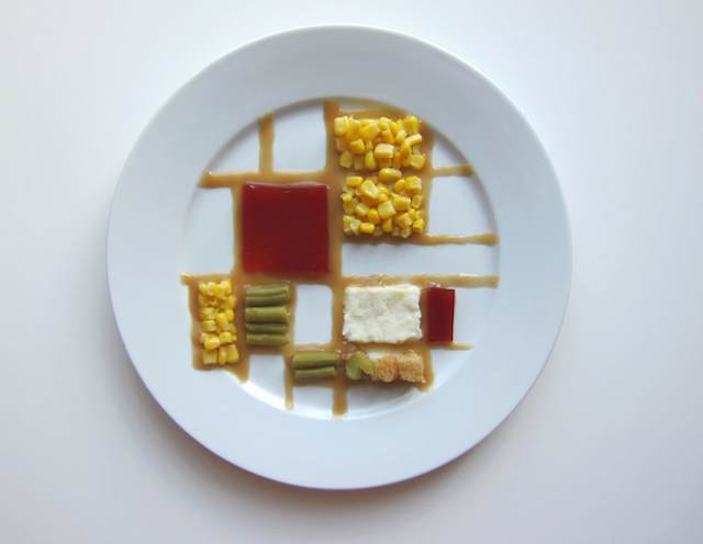 Above is how Van Gogh might play with his food. Mondrian’s and Jackson Pollock’s are shown below. Also featured are Rothko, Warhol, and more…