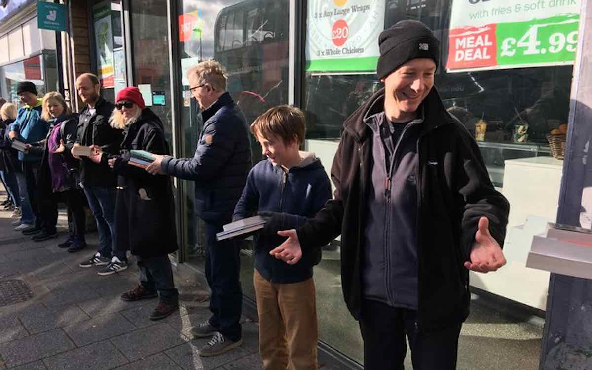 October Books put out a call for volunteers to form a “human conveyor belt” between their old store and the new location 500 feet down the street.