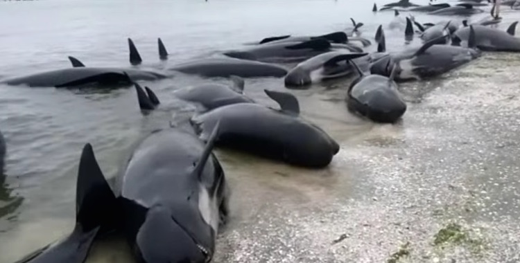 In one of New Zealand’s largest mass whale beachings, over 240 pilot whales were saved by the coming tide.