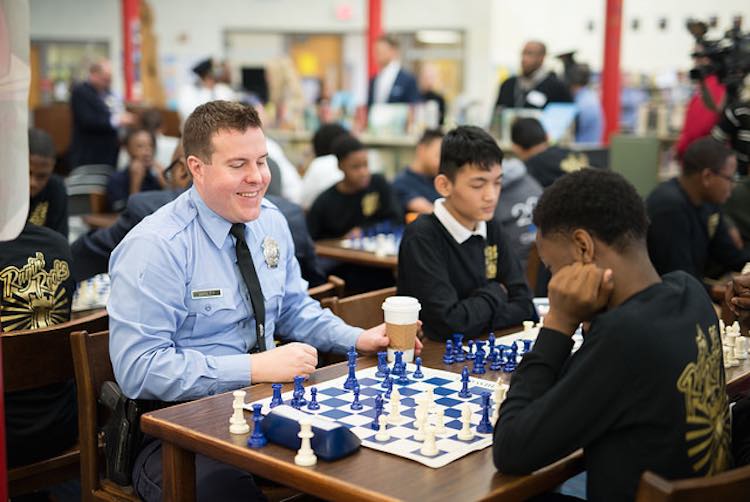 These boys in blue are doing their duty to protect and serve the community by playing facing off with the city’s youth – facing off over a chess board, that is.