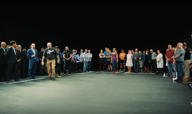 Then, an announcer asks the people to step forward if they relate to a certain statement.