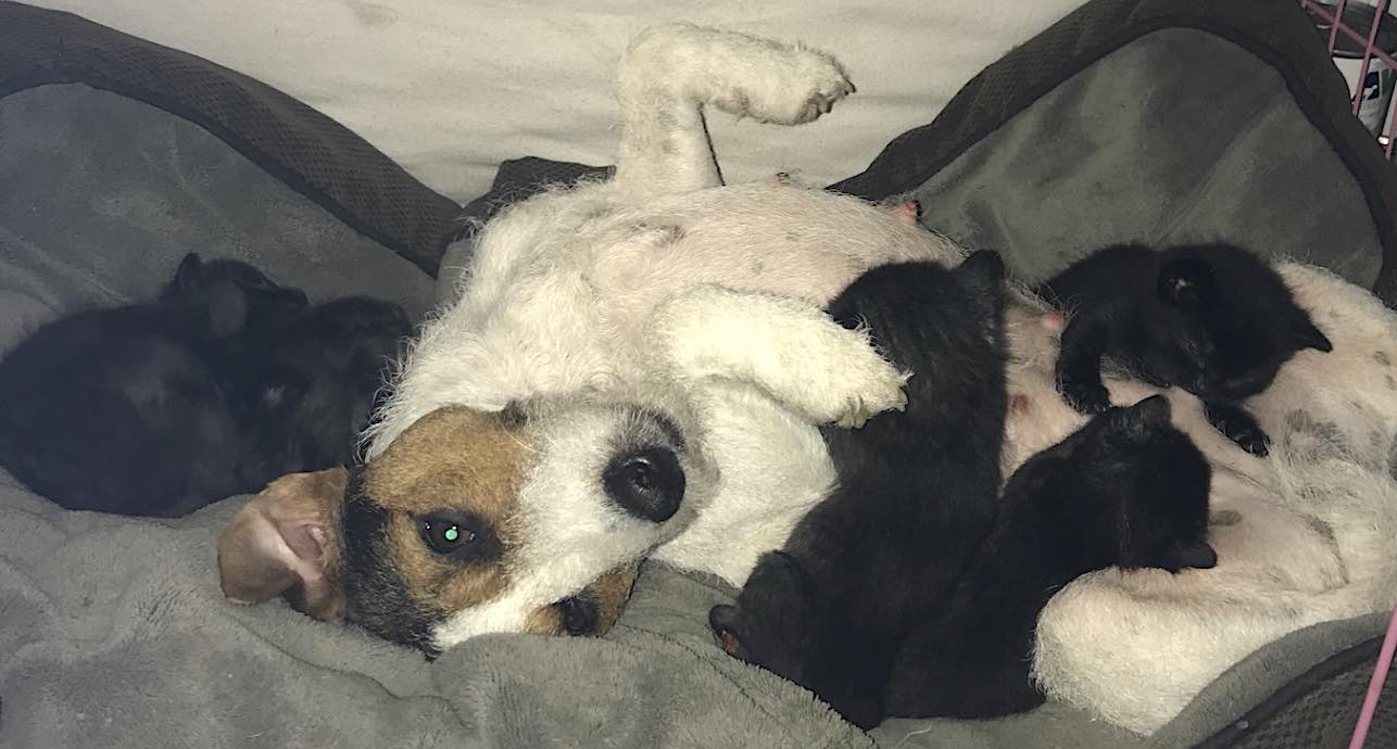Despite having never birthed puppies before, Teasel began to lactate, after the babies began suckling on her—and Sue shared the moments on Facebook.