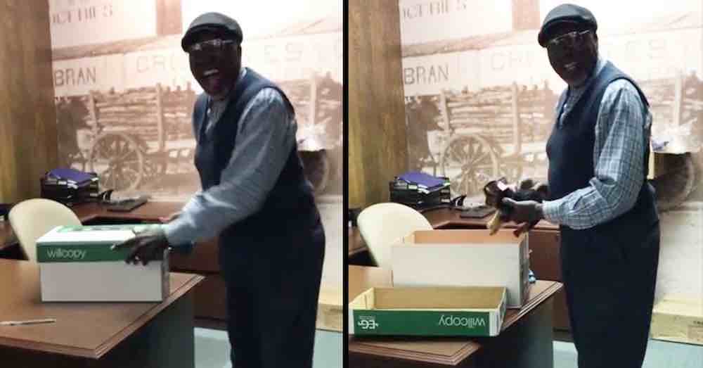 As he inspects the box, the birthday man clearly has no idea what’s in store for him. He opens the gift and quickly closes it again in complete and utter shock.